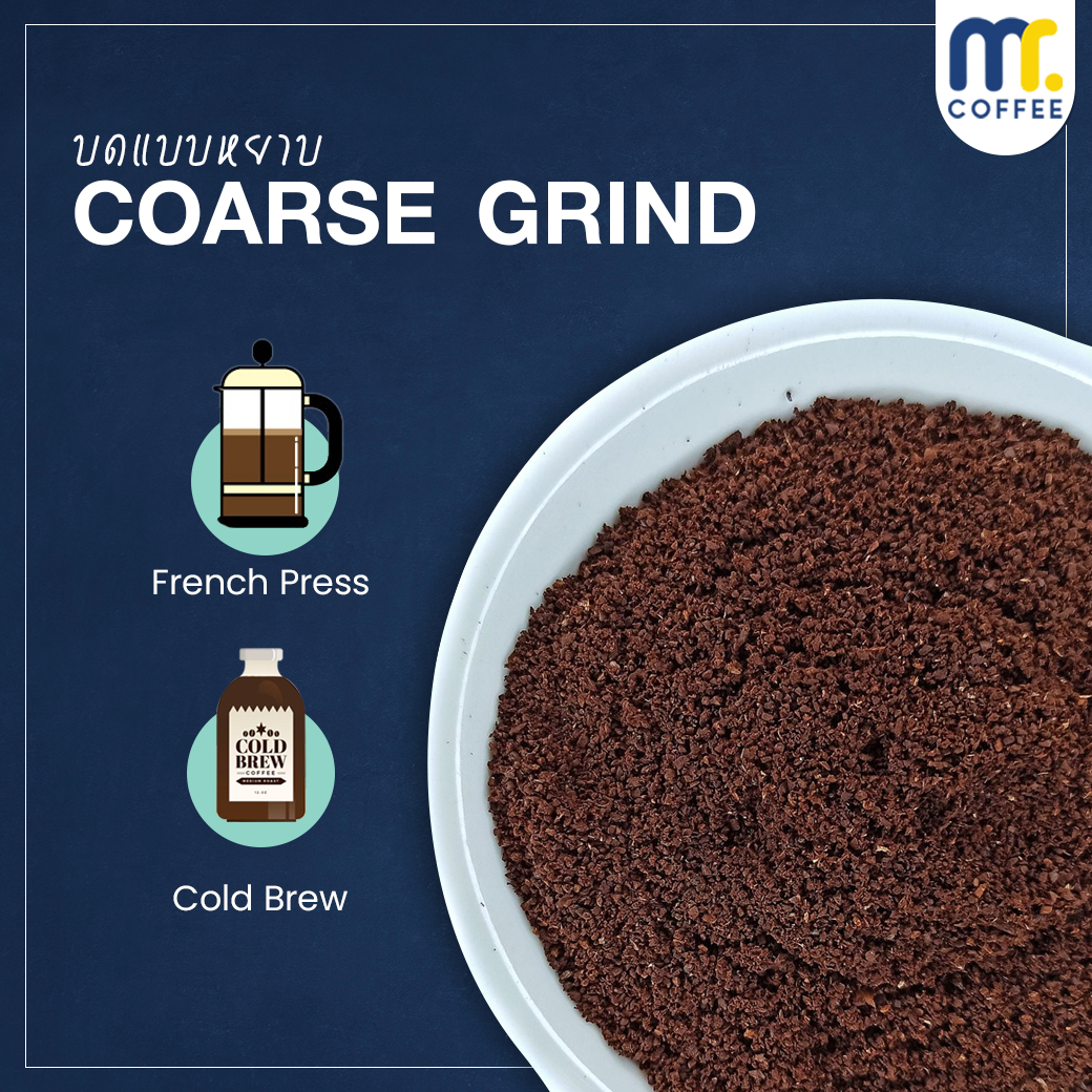 การบดในระดับนี้จะมีกาแฟที่มีลักษณะเป็นเม็ดใหญ่ จับแล้วให้ความรู้สึกเหมือนกรวดทราย หรือดอกเกลือ ซึ่งจะสำหรับการชงแบบเฟรนช์เพรส (French Press) เพราะมีวิธีการชงแบบแช่ผงกาแฟในน้ำร้อนเป็นเวลานาน ผงกาแฟจึงต้องมีความหยาบ เพราะการสกัดตัวช้า ไม่เกิดการสกัดตัวที่มากจนเกินไป และป้องกันไม่ให้ผงกาแฟลอดออกมาจากแผ่นกรองปนกับน้ำกาแฟอีกด้วย และยังเหมาะกับการชงแบบ การสกัดเย็น (Cold Brew) เพราะมีวิธีการชงแบบแช่น้ำเป็นเวลานานเช่นกัน หากผงกาแฟที่มีความละเอียดมากจะทำให้ได้กาแฟที่มีความเข้มและขมจนเกินไป