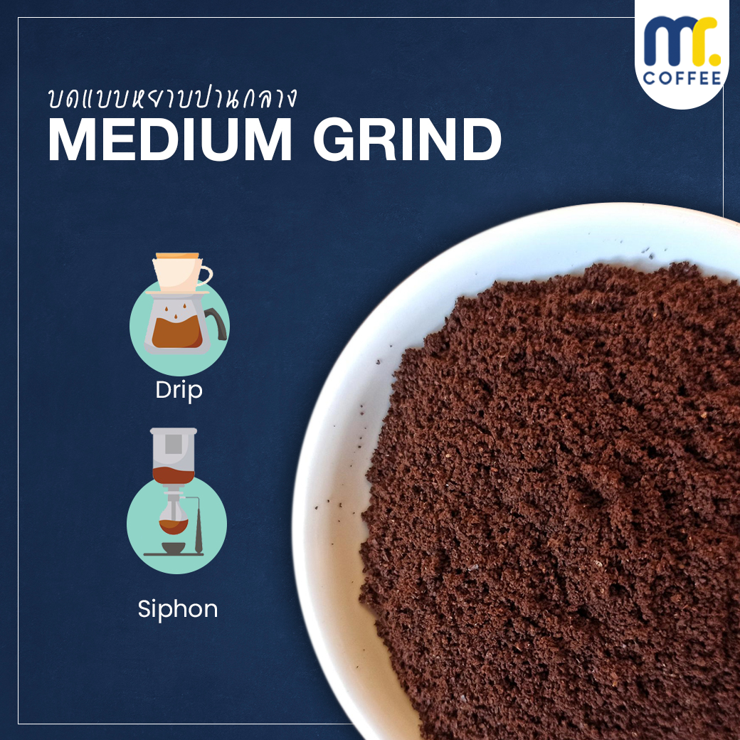 บดแบบปานกลางจะมีความละเอียด จับแล้วคล้ายเม็ดทรายธรรมดาทั่วไป ด้วยความละเอียดเหมือนทราย จึงเหมาะกับ การชงแบบดริป (Pour Over or Filter Brewers) เป็นการชงที่ใช้การซึมผ่านของน้ำร้อนที่ผ่านตัวกาแฟ โดยสกัดเอารสชาติออกมา หากผงของกาแฟมีความละเอียดมาก น้ำจะซึมผ่านกาแฟได้ช้า ก็จะทำให้กาแฟถูกสกัดตัวมากเกินไป และยังเหมาะกับการชงแบบแอโร่เพรส (Aeropress) ที่เป็นการผสมกันระหว่างเครื่องชงเอสเพรสโซ่และการชงแบบฟิลเตอร์ โดยใช้ลูกสูบเพื่อดันน้ำผ่านกาแฟบดและผ่านตัวกรอง ซึ่งสำหรับใครที่ต้องการชงให้ไว้ขึ้น สามารถปรับให้กาแฟละเอียดขึ้นได้ แต่หากใช้กาแฟที่มีความหยาบกว่านี้ก็ต้องต้องเพิ่มเวลาในการชงด้วย และสุดท้ายยังเหมาะกับการชงแบบไซฟอน (Syphon Brewer) เป็นการชงแบบแช่เช่นเดียวกัน โดยสามารถปรับระยะเวลาในการชงให้เหมาะกับระดับของผงกาแฟได้ ซึ่งหากกาแฟมีความหยาบมากเกินไปจะทำให้ต้องใช้ระยะเวลาในการชงนานขึ้น อาจจะทำให้กาแฟมีรสขม ไม่อร่อย