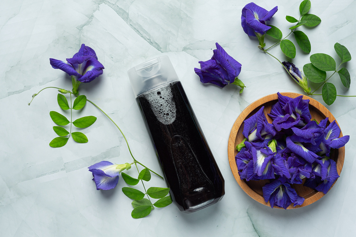 ดอกอัญชัน เป็นไม้เถา มีดอกสีม่วงอมน้ำเงินสวยงามตามธรรมชาติ ทำให้นิยมนำมาคั้นเป็นสีผสมอาหาร คุณประโยชน์ของดอกอัญชันยังครอบคลุมไปถึงสรรพคุณทางยาอันหลากหลาย เช่น ลดไข้ แก้หอบหืด เป็นต้น